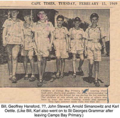 Prize giving nights were held in the ballroom at the Rotunda Hotel. Our boys’ school uniform (grey shorts and long stockings, white shirt, tie and bottle-green blazer) underwent a major fashion revolution with the introduction in 1949 of “bush jackets” (much later they would be called “safari suits”) and I was selected along with a few of my mates to “model” for a newspaper article (like me, Karl also went went on to St Georges Grammar after leavng Camps Bay Primary) – an early touch of Americanism was added in that we gave up our ordinary school caps and instead wore a bottle-green baseball cap.
