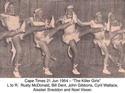”Hundreds of Boy Scouts and cubs laughed and cheered yesterday afternoon at these “Killer Girls” - part of The Cape Western Scout Show, a travelling variety show in aid of Scout Funds. The “Girls” were the hit of the afternoon as they can-canned and whirled around, kicking their legs in true chorus style. The show, which has an all-male cast, and is produced by Frank Quinn, leaves Johannesburg for Durban to-morrow. By the time the boys return to Cape Town early in July, they will have played in 10 different South African towns.”