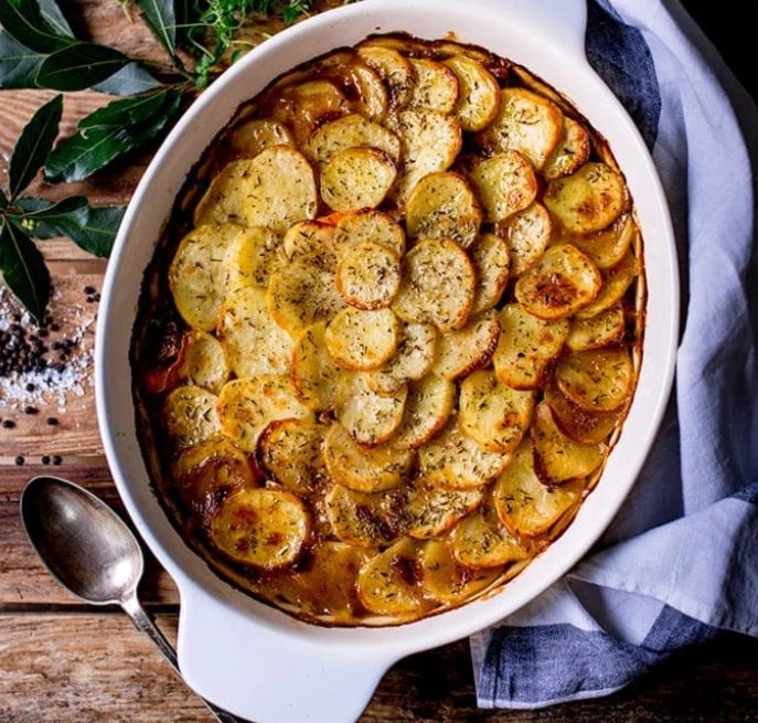 Lancashire hotpot is a stew originating from Lancashire in the North West of England. It consists of lamb or mutton and onion, topped with sliced potatoes and baked in a heavy pot on a low heat.